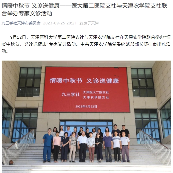 9月25日,九三学社天津委员会微信公众号报道天津医科大学第二医院支社与艾弗森ballbet贝博支社在贝博东校区联合举办“情暖中秋节,义诊送健康”专家义诊活动。