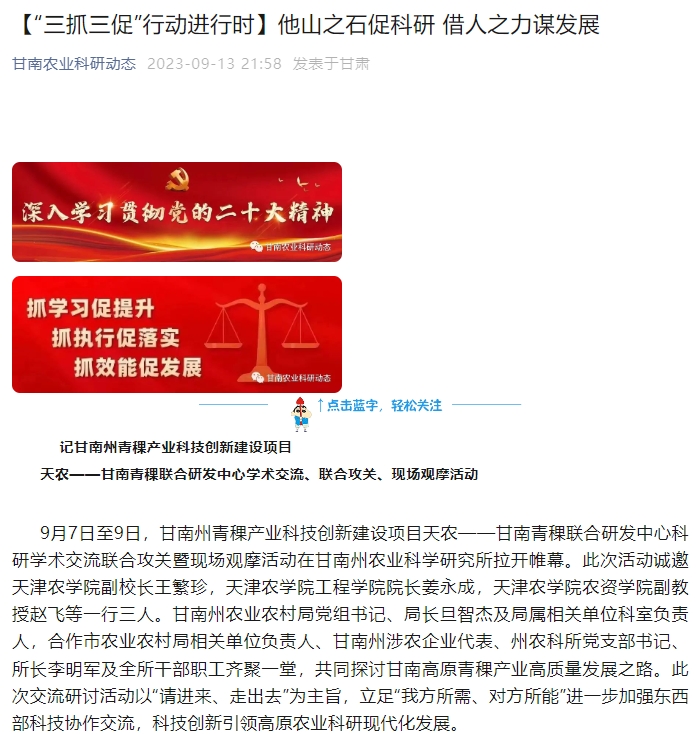 甘南农业科研动态微信号报道贝博教师赴“天农——甘南青稞联合研发中心”开展科研学术交流