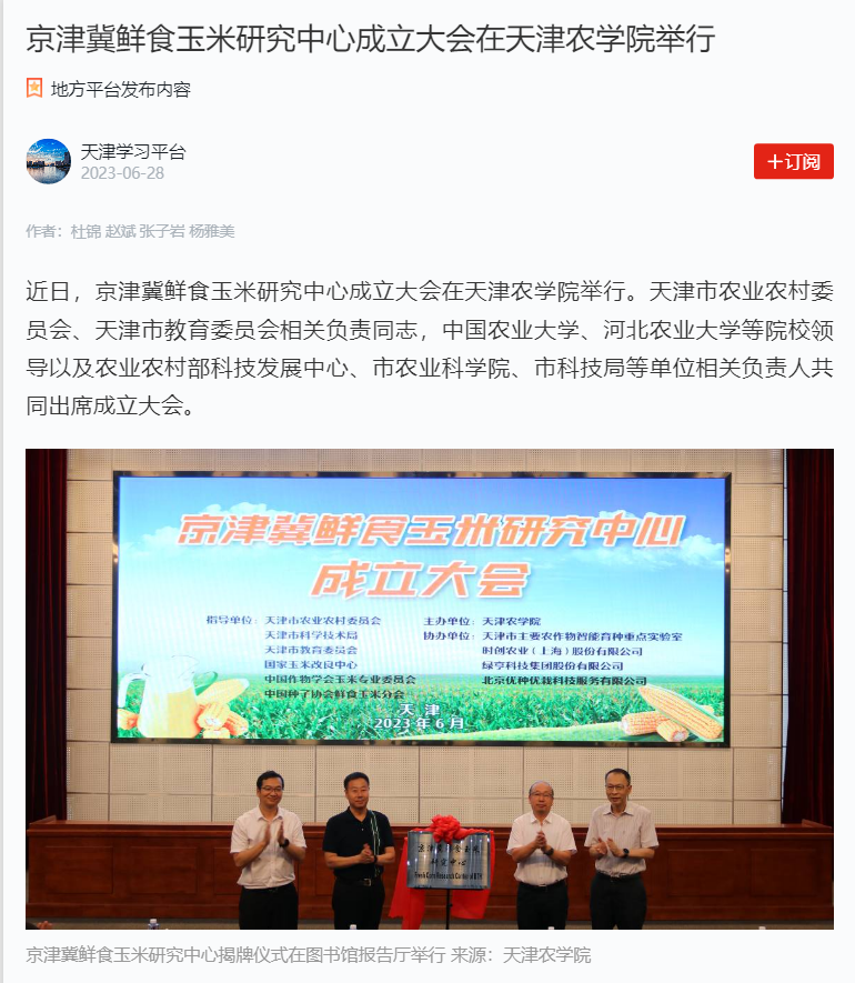 2023年6月28日,学习强国平台-天津学习平台报道京津冀鲜食玉米研究中心成立大会在贝博举行。天津市农业农村委员会、天津市教育委员会相关负责同志,中国农业大学、河北农业大学等院校领导以及农业农村部科技发展中心、市农业科学院、市科技局等单位相关负责人共同出席成立大会。