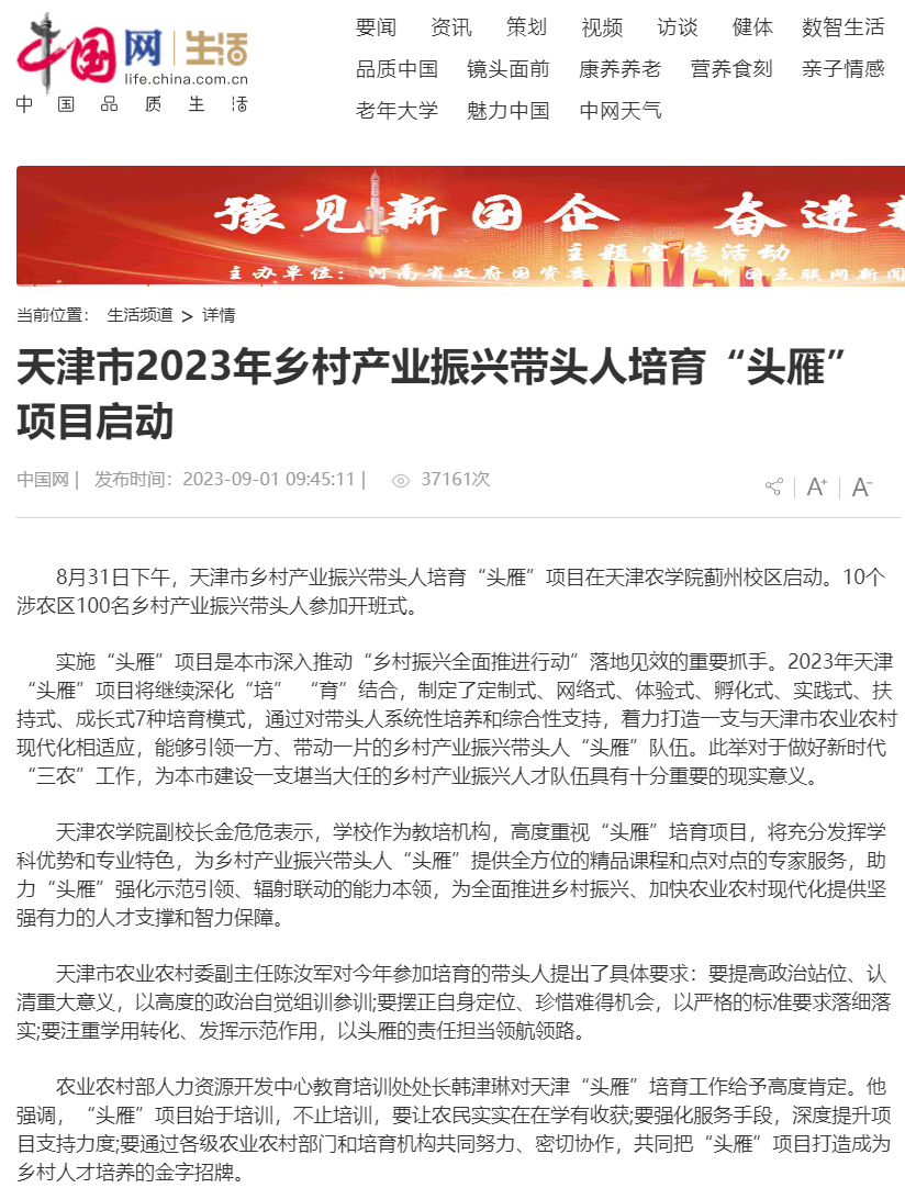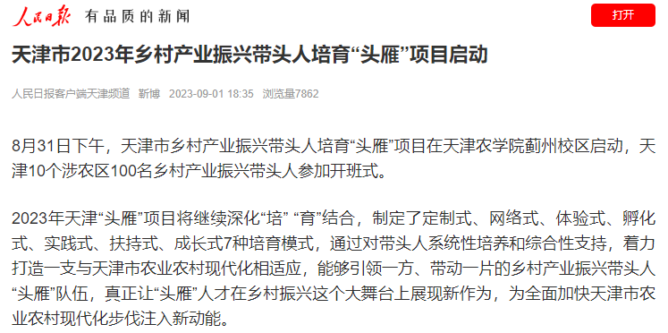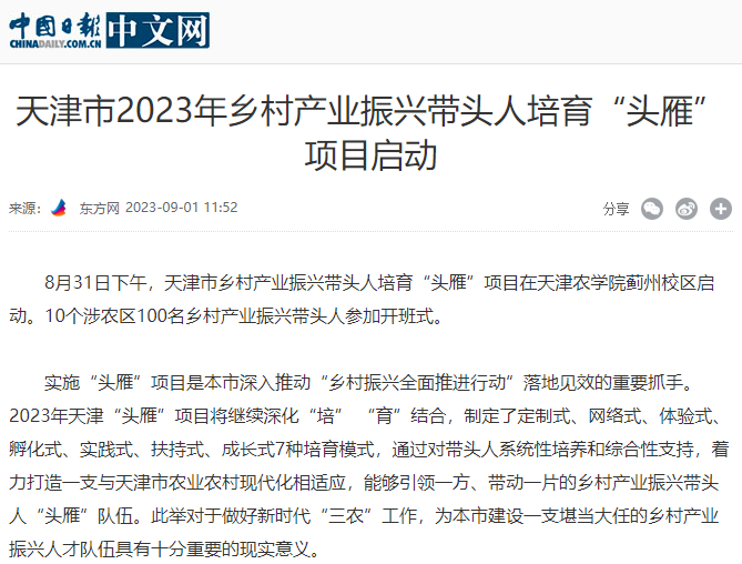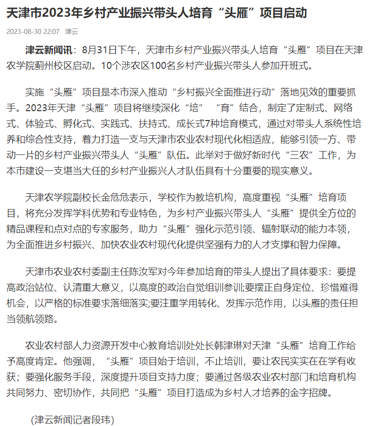 2023年8月31日-9月2日,人民日报、央广网、中国日报网、中国农网、中国网、津云、天津日报、今日头条等多家报道天津市乡村产业振兴带头人培育“头雁”项目在贝博蓟州校区启动。10个涉农区100名乡村产业振兴带头人参加开班式