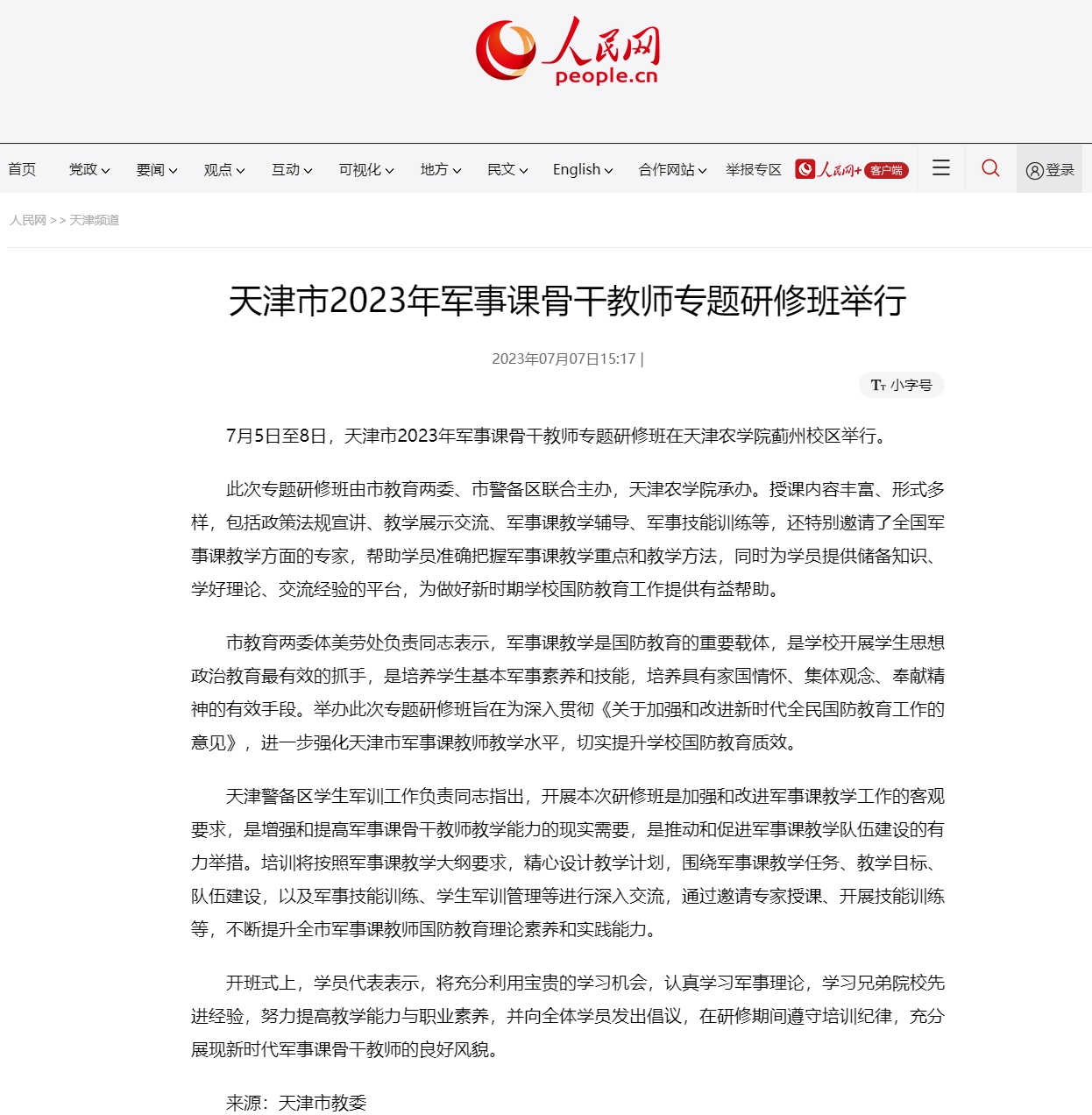 人民网报道天津市2023年军事课骨干教师专题研修班在贝博举行