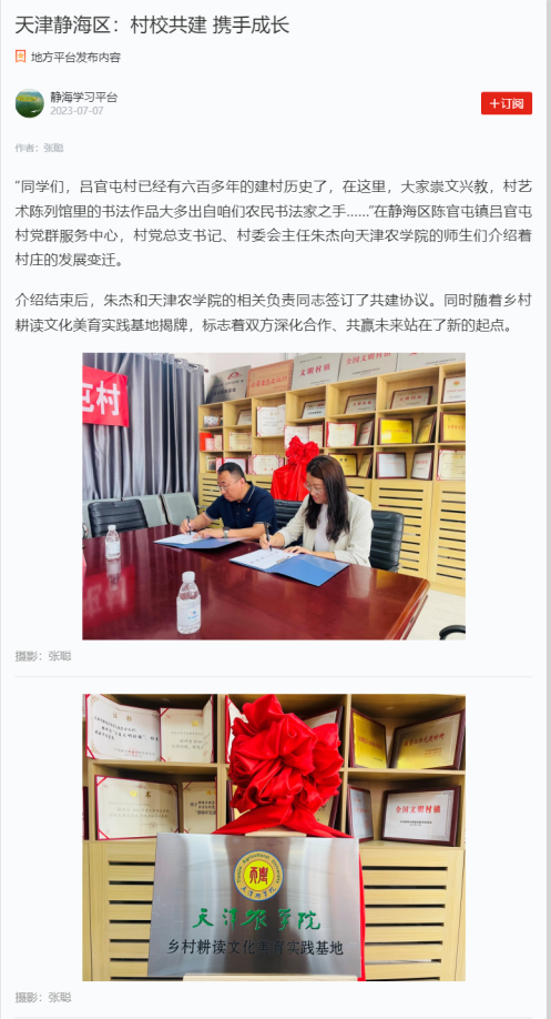 2023年7月7日,学习强国平台-静海学习平台以《天津静海:村校共建 携手成长》为题报道贝博团委与静海区陈官屯镇吕官屯村签订了共建协议并为乡村耕读文化美育实践基地揭牌,同时开展了“金句润学子”主题教育实践活动。他们将以多种方式参与和支持静海区的“三农”工作,打造务实有效的活动载体和工作项目,让广大青年学生在服务静海乡村振兴的生动实践中,厚植爱农情怀,练就兴农本领。