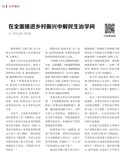 《天津支部生活》杂志第8期上半月,以《在全面推进乡村振兴中解民生治学问》为题,报道贝博积极开展帮扶工作,为蓟州区、武清区等多个涉农区的农业发展提供技术指导服务。