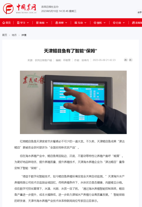 2023年5月9日,中国农网报道国家海水鱼产业技术体系智能化养殖岗位科学家、天津市海水养殖产业技术体系物联网岗位专家,贝博计算机与信息工程学院教授田云臣及其团队共同研发的海水养殖智能控制系统。通过该系统,鳎目鱼产量进一步提升,成本大幅降低,进一步助力津城水产养殖行业高质量发展。