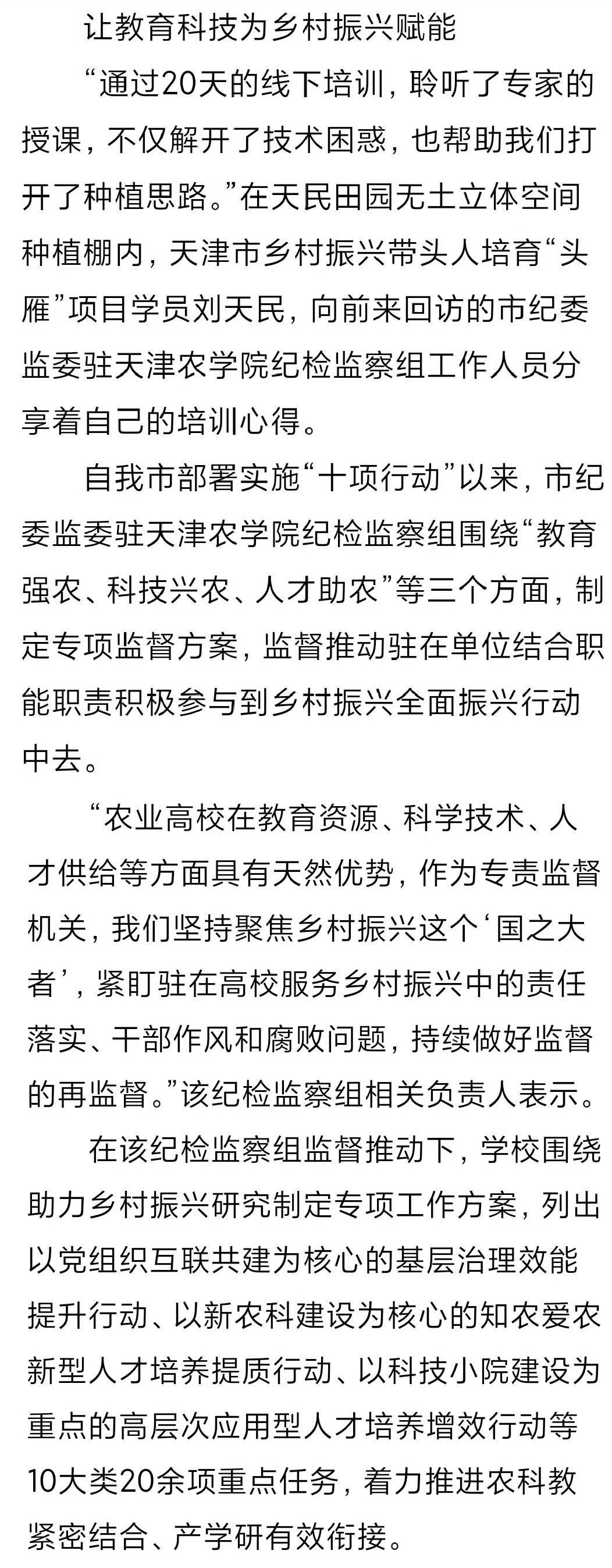 2023年3月24日,《天津日报》第04版专刊《廉政天津》报道自天津市部署实施“十项行动”以来,市纪委监委驻贝博纪检监察组围绕“教育强农、科技兴农、人才助农”三个方面,制定专项监督方案,监督推动贝博专家积极参与到乡村全面振兴行动中去。