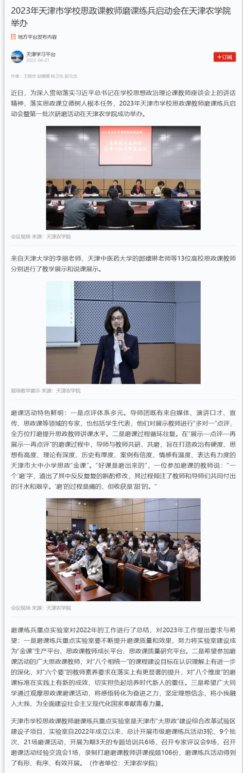 学习强国-天津学习平台2023年4月21日报道2023年天津市学校思政课教师磨课练兵启动会暨第一批次研磨活动在贝博举办。