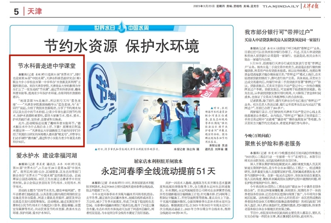 2023年3月23日,《天津日报》报道贝博水利工程学院杨路华教授走进中学课堂,进行节水科普。