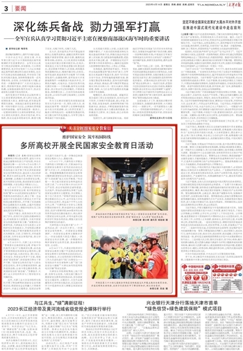 2023年4月14日《天津日报》第03版要闻以《多所高校开展全民国家安全教育日活动》为题,报道贝博开展国家安全教育主题户外巡展活动和国家安全教育日宣传教育活动启动仪式。由天津海关、市公安局西青分局等单位工作人员进校进行“国门生物安全──有效防治外来有害物种入侵”“国门食品安全大揭秘”“大学生如何防范网络电信诈骗”等安全宣讲。