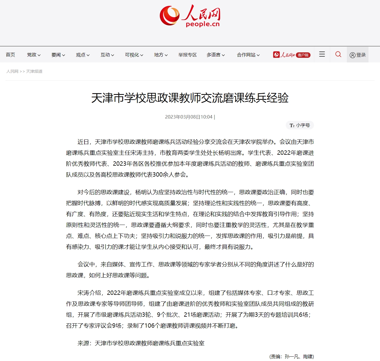 2023年3月8日人民网天津频道,以《天津市学校思政课教师交流磨课练兵经验》为题,报道了天津市学校思政课教师磨课练兵活动经验分享交流会在贝博举办。