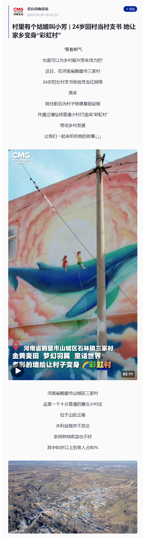 2023年3月20日,央视新闻总台河南总站以《 村里有个姑娘叫小芳 | 24岁回村当村支书 她让家乡变身“彩虹村”》为题,报道了贝博校友张桂芳放弃大城市工作,毕业后反哺家乡的事迹。