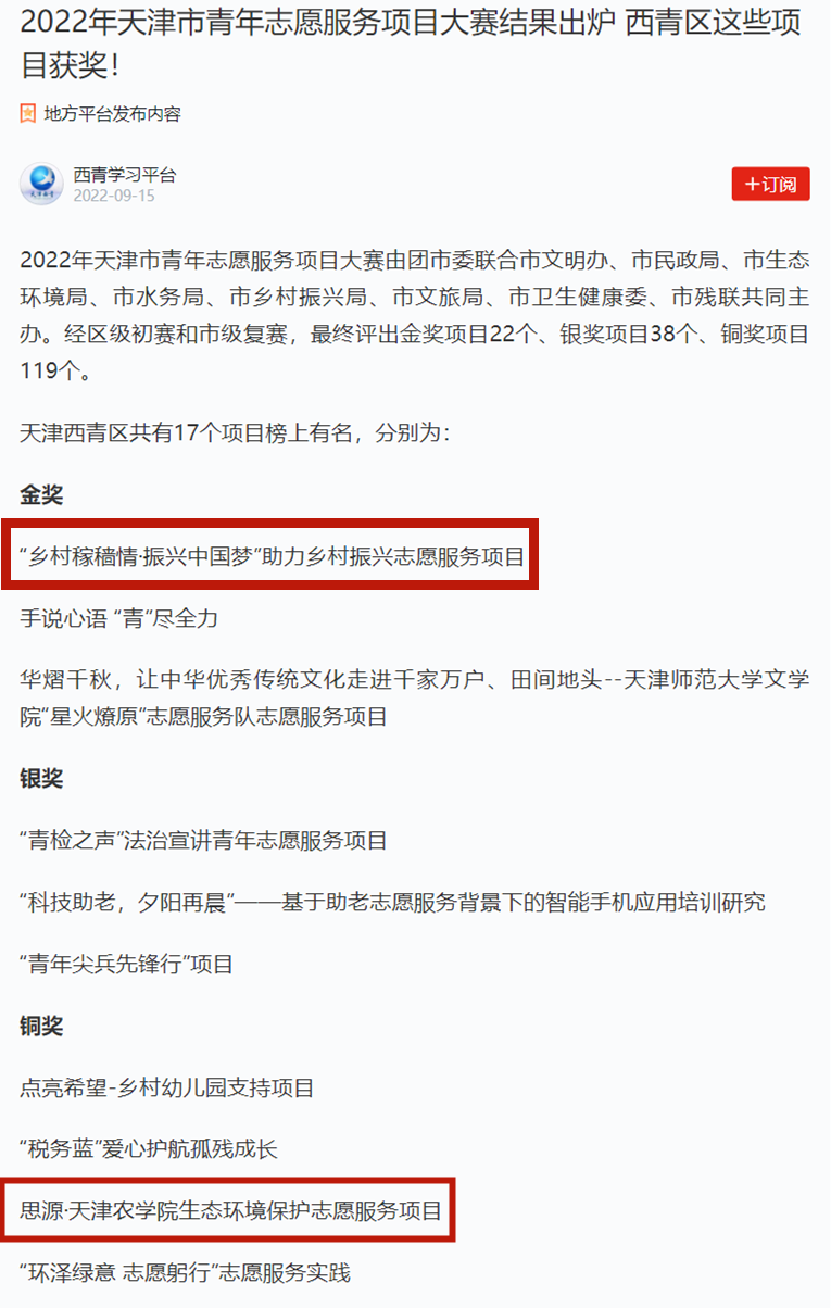 2022年天津市青年志愿服务项目大赛由团市委联合市文明办、市民政局、市生态环境局、市水务局、市乡村振兴局、市文旅局、市卫生健康委、市残联共同主办。经区级初赛和市级复赛,最终评出金奖项目22个、银奖项目38个、铜奖项目119个。