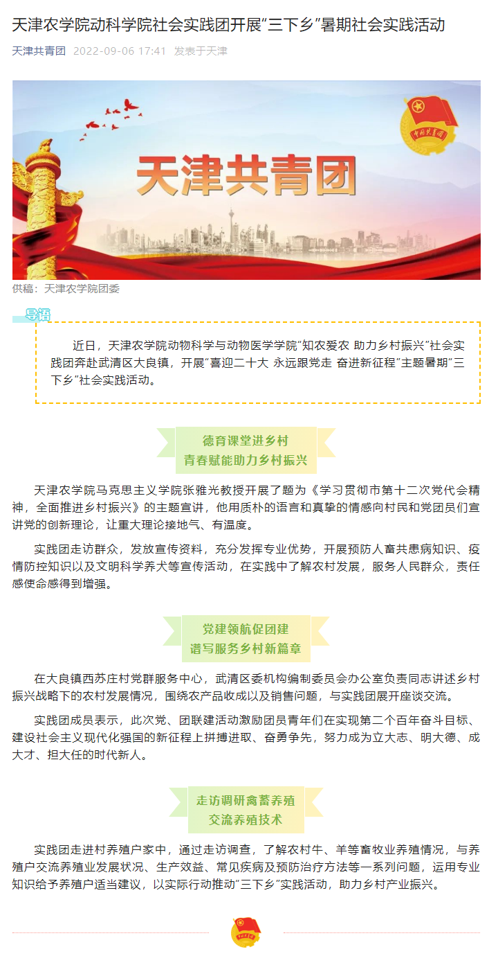 近日,艾弗森ballbet贝博动物科学与动物医学学院“知农爱农 助力乡村振兴”社会实践团奔赴武清区大良镇,开展“喜迎二十大 永远跟党走 奋进新征程”主题暑期“三下乡”社会实践活动。
