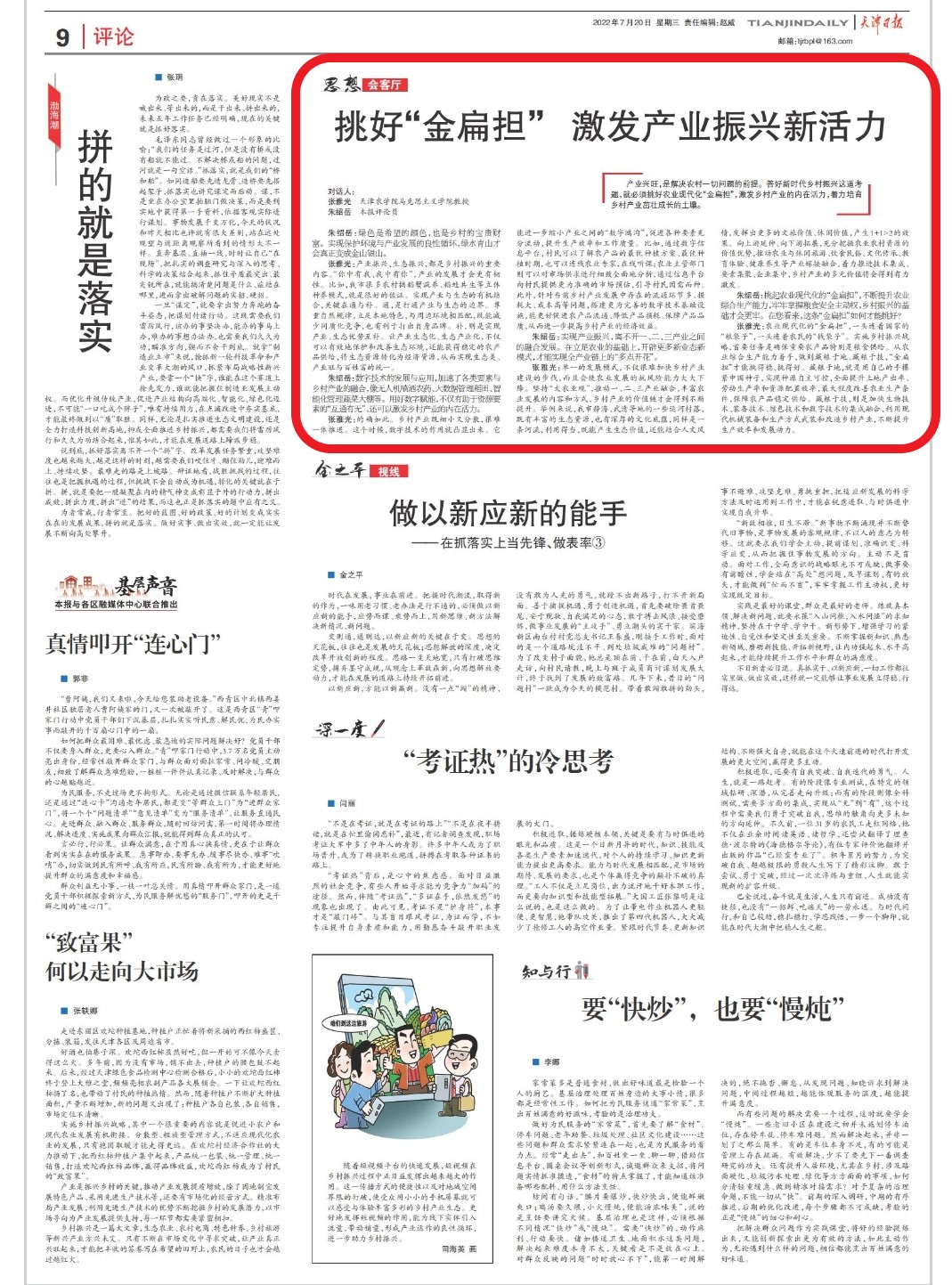 张雅光:单一的发展模式,不仅很难加快乡村产业建设的步伐,而且会使农业发展的抗风险能力大大下降。坚持“大农业观”,推动一、二、三产业融合,丰富农业发展的内容和方式,乡村产业的价值链才会得到不断提升。举例来说,我市静海、武清等地的一些运河村落,既有丰富的生态资源,也有深厚的文化底蕴,同样是一条河流,利用得当,既能产生生态价值,还能结合人文风情,发挥出更多的文旅价值、休闲价值,产生1+1>2的效果。向上游延伸、向下游拓展,充分挖掘农业农村资源的价值优势,推动农业与休闲旅游、饮食民俗、文化传承、教育体验、健康养生等产业嫁接融合,着力推进技术集成、要素集聚、企业集中,乡村产业的多元价值将会得到有力激发。