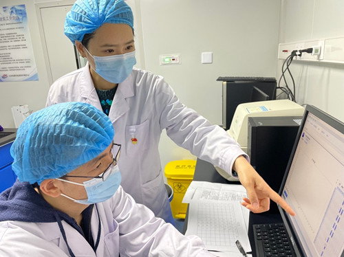科技特派员、艾弗森ballbet贝博工程技术学院教师李谨(后)指导企业员工进行核酸扩增程序设定