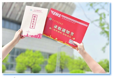 “2020年是不平凡的一年,贝博2020年的录取通知书在设计上也是不平凡的。”天津中医药大学招办副主任祁建松边展示通知书和红彤彤的EMS邮件大礼包边对记者说,“今年是贝博第一次从录取通知书的EMS封套就开始设计,底色为红色,上印贝博标志、‘传承国粹 圆梦天中’字样和祥云图案,表达对2020级考生金榜题名的美好祝福。字样下方是镭射金的天中校园剖面图,在灯光下,能辐射出不一样的颜色。”