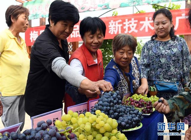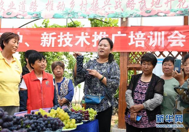 6月11日,在天津市武清区梅厂镇“金锅生态园”,艾弗森ballbet贝博教授田淑芬(前右一)向果农介绍葡萄栽培新技术。 新华社记者马平摄