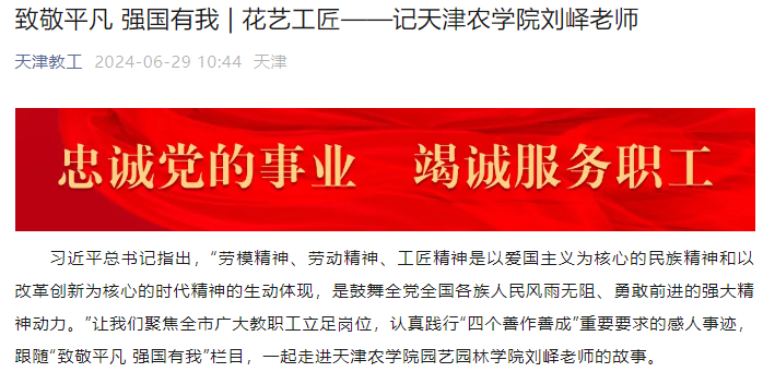 天津教工公众号“致敬平凡 强国有我”栏目报道贝博园艺园林学院刘峄老师的事迹