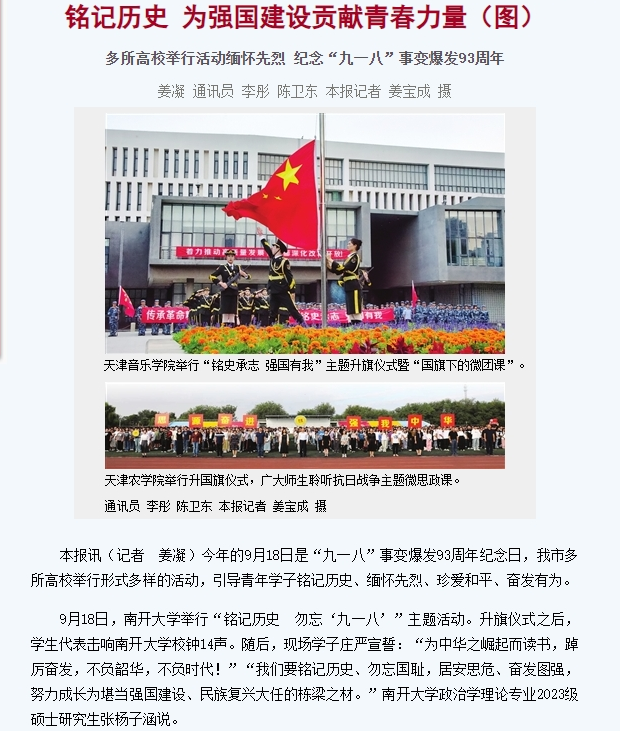2024年9月18-19日,《天津日报》、津云客户端、新浪微博等媒体报道贝博举行以“思源奋进 强我中华”为主题的思政育人活动,引导学生们坚定理想信念,让红色基因代代传承。