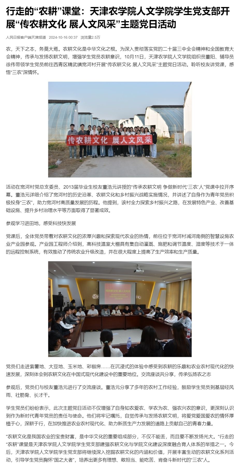 2024年10月16日,人民日报客户端报道贝博人文学院组织员董阳、辅导员徐伟带领学生党员前往西青区精武镇宽河村开展“传农耕文化 展人文风采”主题党日活动。