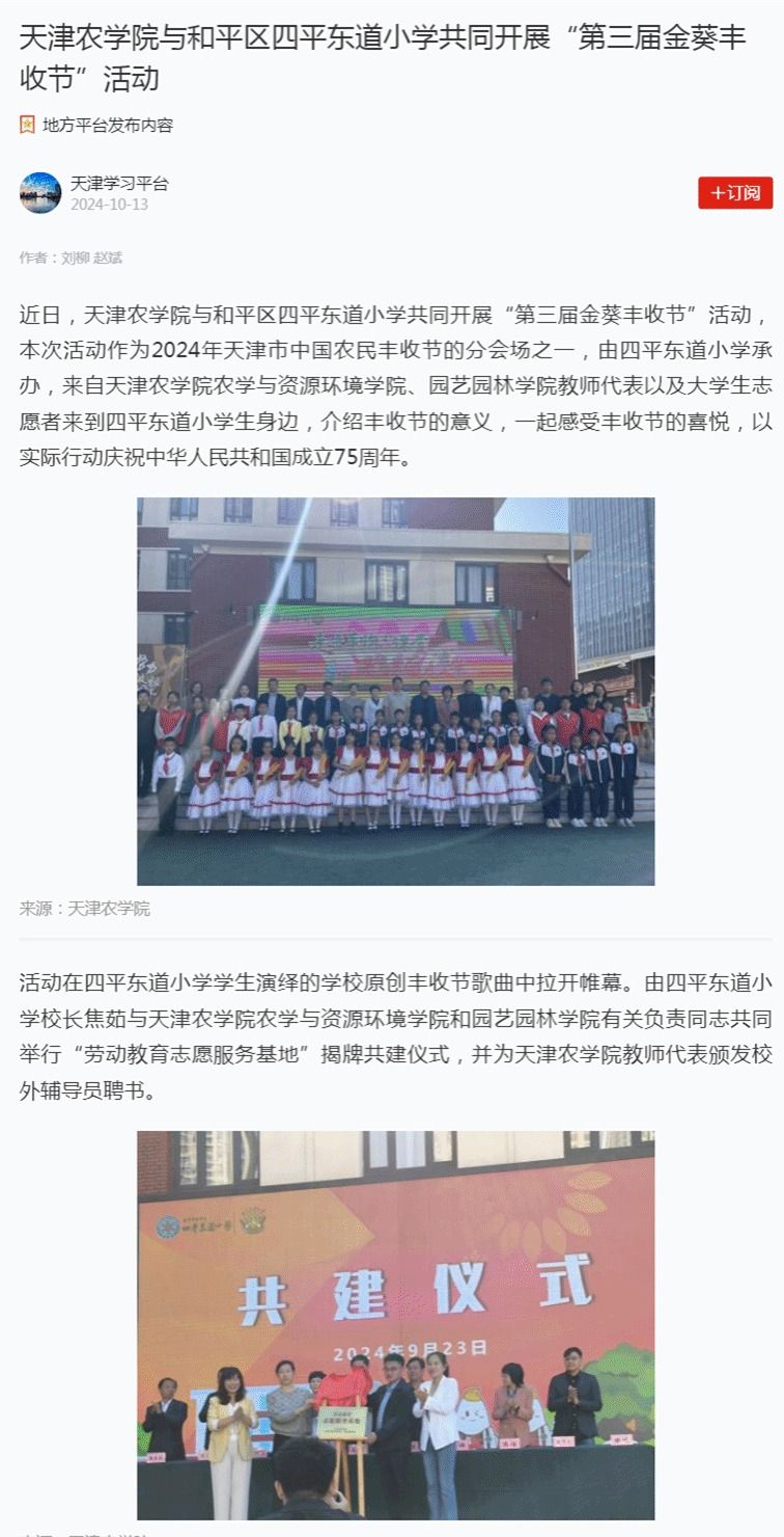 2024年10月13日,学习强国平台-天津学习平台报道,贝博与和平区四平东道小学共同开展“第三届金葵丰收节”活动。