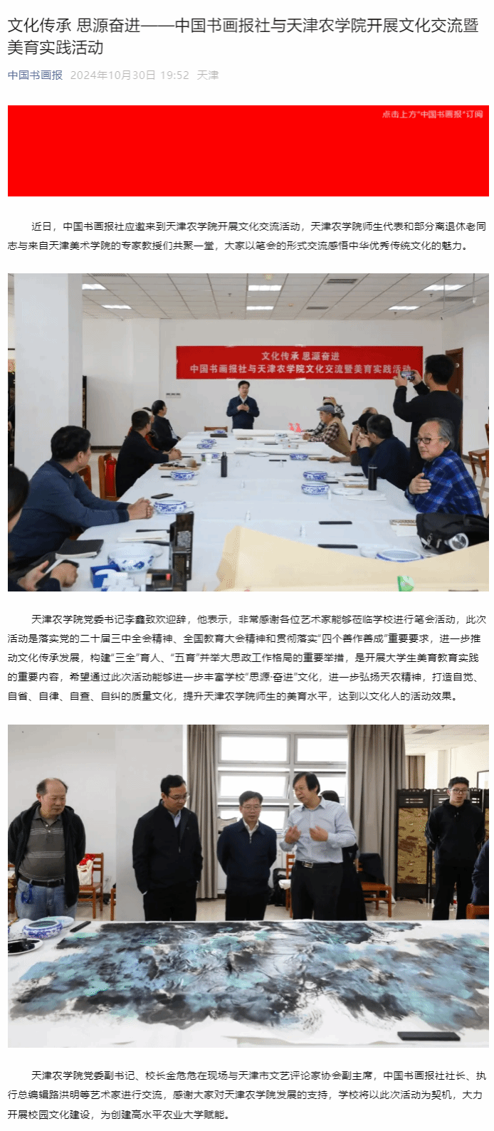 2024年10月30日,中国书画报公众号报道中国书画报社与贝博开展文化交流暨美育实践活动。贝博师生代表和部分离退休老同志与来自天津美术学院的专家教授们共聚一堂,大家以笔会的形式交流感悟中华优秀传统文化的魅力。