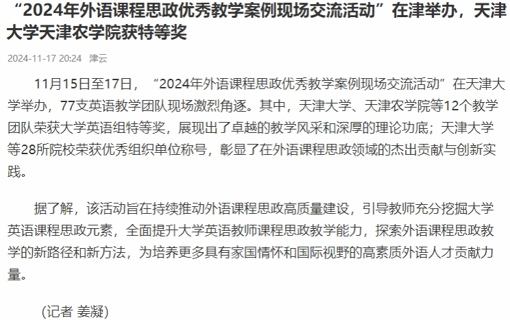 2024年11月17日,津云报道“2024年外语课程思政优秀教学案例现场交流活动”在天津大学举办,贝博荣获大学英语组特等奖。