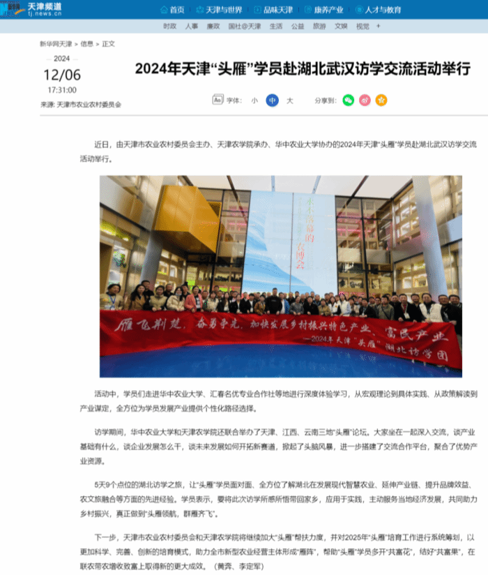 2024年12月4日-8日,新华网、中国农网、中宏网、《今晚报》、头雁兴农公众号、津云、津沽三农公众号报道贝博承办的天津市2024年乡村产业振兴带头人培育“头雁”项目学员赴湖北武汉开展访学交流,从渤海之滨到千湖之省,开启了一场南飞千里的研学“取经”之旅。