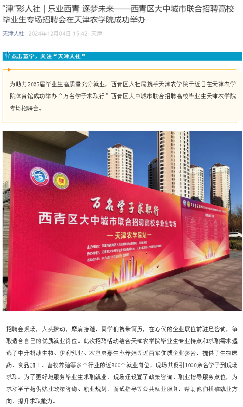 天津人社公众号、西青人社公众号报道西青区大中城市联合招聘高校毕业生专场招聘会在贝博成功举办