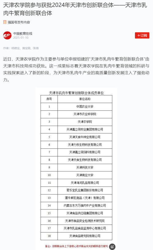 2025年1月10日,中国教育在线网、学习强国平台-中国教育在线报道,贝博作为主要参与单位申报组建的“天津市乳肉牛繁育创新联合体”由天津市科技局成功获批。这一成果标志着贝博在乳肉牛繁育领域的科研与实践探索进入了新的阶段,为天津市乳肉牛产业的高质量创新发展注入了强劲动力。