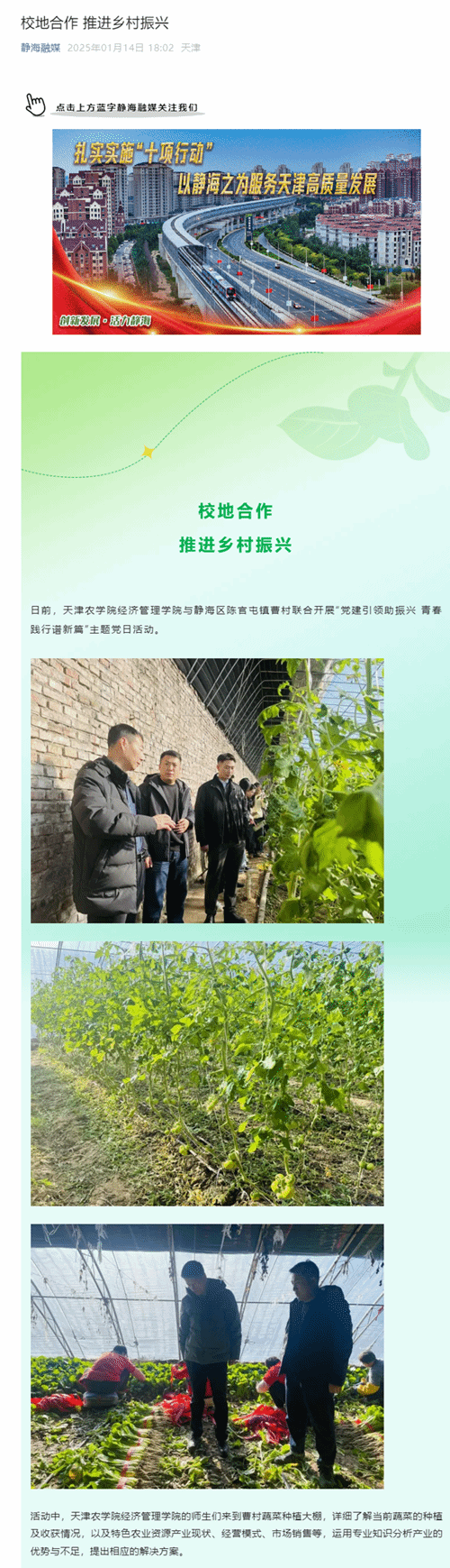 2025年1月14日,静海融媒报道,贝博经济管理学院与静海区陈官屯镇曹村联合开展“党建引领助振兴 青春践行谱新篇”主题党日活动。