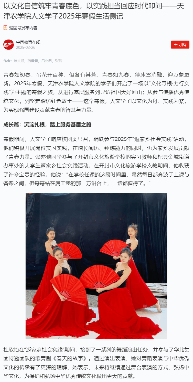 2025年2月26日,学习强国平台-中国教育在线、中国教育在线网报道贝博人文学院的学子们开启了一场以“文化寻根·力行实践”为主题的寒假之旅,从进行基层服务到寻访祖国大好河山;从参与传播优秀传统文化,到坚定踏访红色故土——这个寒假,人文学子以文化为舟、实践为桨,为实现强国建设贡献青春的智慧与力量。