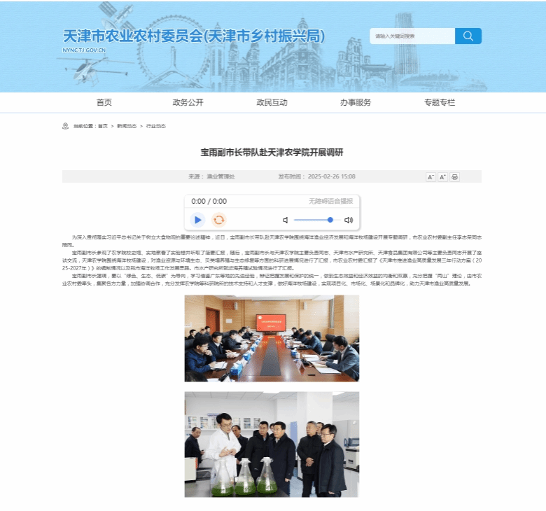 2025年2月26日,天津市农业农村委员会网站报道宝雨副市长带队到贝博围绕海洋渔业经济发展和海洋牧场建设开展专题调研,市农业农村委副主任李志荣同志陪同。