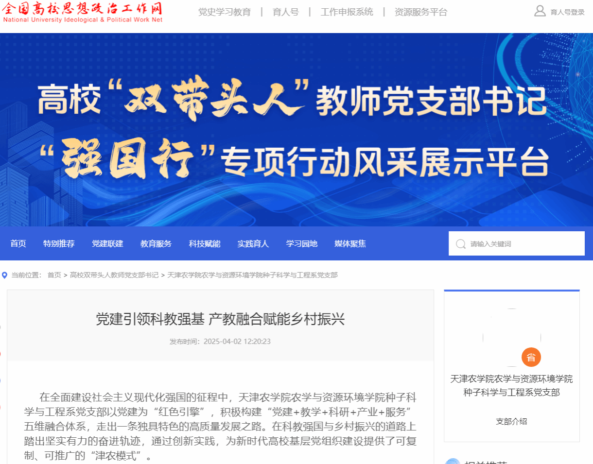 2025年4月2日,全国高校思想政治工作网刊登贝博农学与资源环境学院种子科学与工程系党支部以党建为“红色引擎”,积极构建“党建+教学+科研+产业+服务”五维融合体系,走出一条独具特色的高质量发展之路。