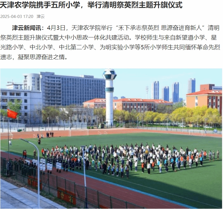 2025年4月3-4日,《天津日报》、津云、北方网、学习强国平台-中国教育在线、中国教育在线网、天津西青公众号等多家媒体报道, 贝博联合天津市新望道小学、星光路小学、中北小学、中北第二小学、为明实验小学等5所学校共同举行“禾下承志祭英烈 思源奋进育新人”清明祭英烈主题升旗仪式,共同缅怀革命先烈遗志,凝聚思源奋进之情。