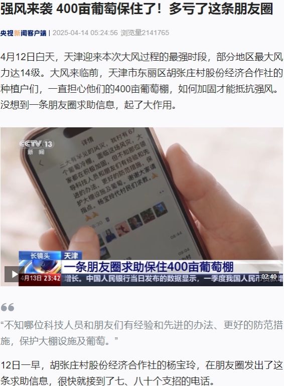 2025年4月14日,央视新闻客户端、央视新闻《朝闻天下》、央视新闻《长镜头》、津门教育公众号等多家媒体、栏目报道贝博园艺园林学院田淑芬研究员指导天津市东丽区葡萄种植户应对大风天气开展农业设施加固。