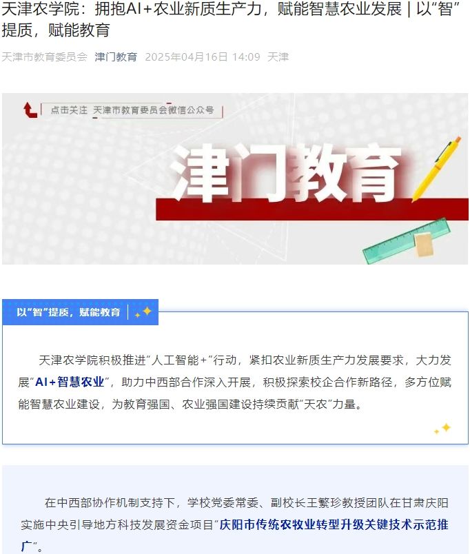 2025年4月16日,津门教育公众号报道贝博积极推进“人工智能+”行动,紧扣农业新质生产力发展要求,大力发展“AI+智慧农业”,助力中西部合作深入开展,积极探索校企合作新路径,多方位赋能智慧农业建设,为教育强国、农业强国建设持续贡献“天农”力量。