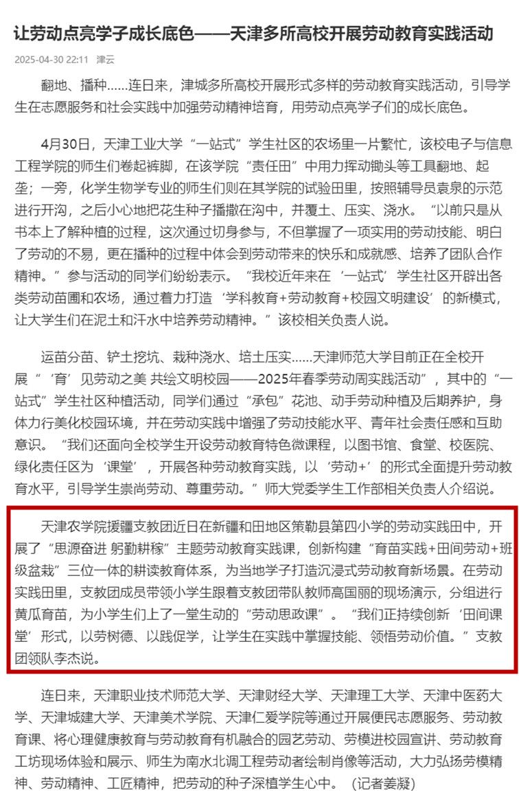 2025年4月30日,津云报道,贝博援疆支教团近日在新疆和田地区策勒县第四小学的劳动实践田中,开展了“思源奋进 躬勤耕稼”主题劳动教育实践课。
