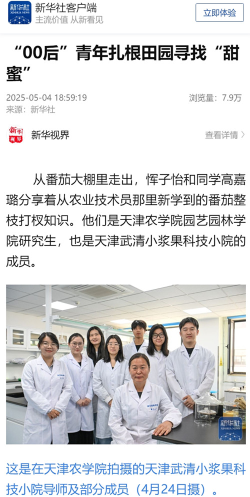 2025年5月4日,新华社客户端报道,贝博园艺园林学院研究生、天津武清小浆果科技小院成员们从校园步入田间大棚,把论文书写在祖国大地上,在泥土中绽放青春。
