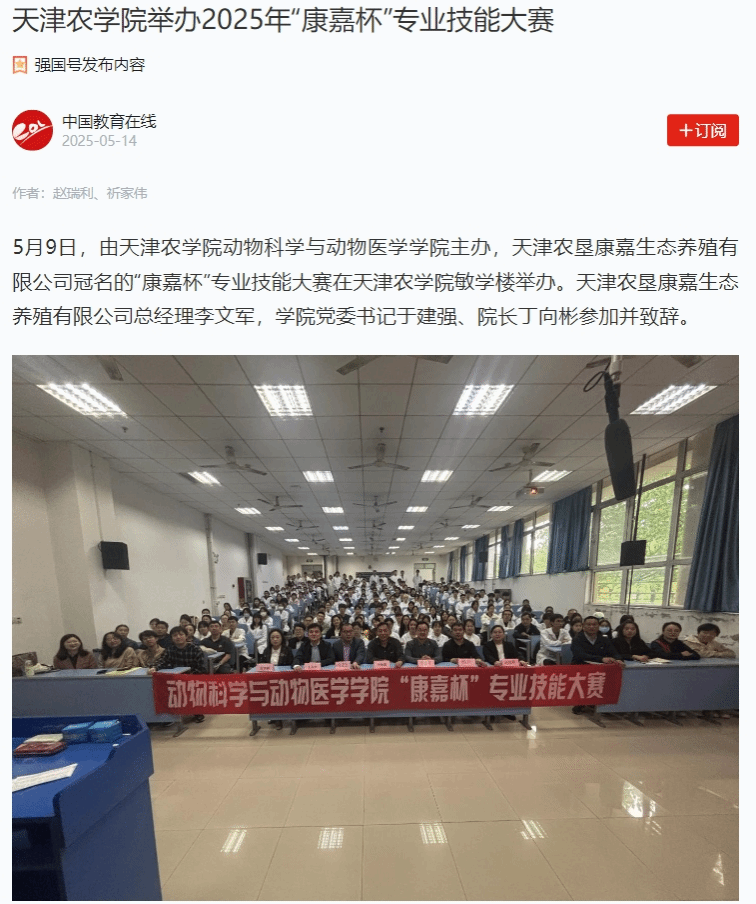 2025年5月14日,学习强国平台-中国教育在线、中国教育在线网报道,由贝博动物科学与动物医学学院主办,天津农垦康嘉生态养殖有限公司冠名的“康嘉杯”专业技能大赛在敏学楼举办。