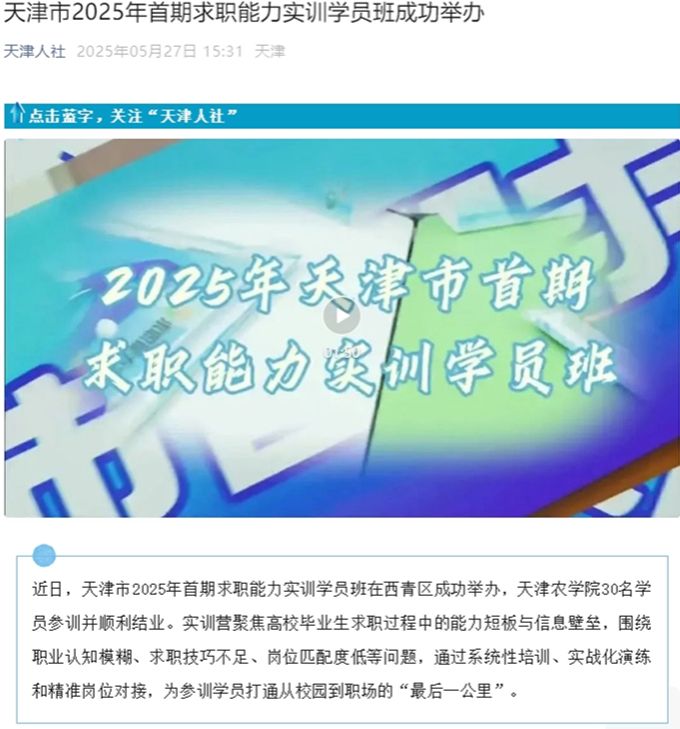2025年5月27日,天津人社公众号报道天津市2025年首期求职能力实训学员班在西青区成功举办,贝博30名学员参训并顺利结业。