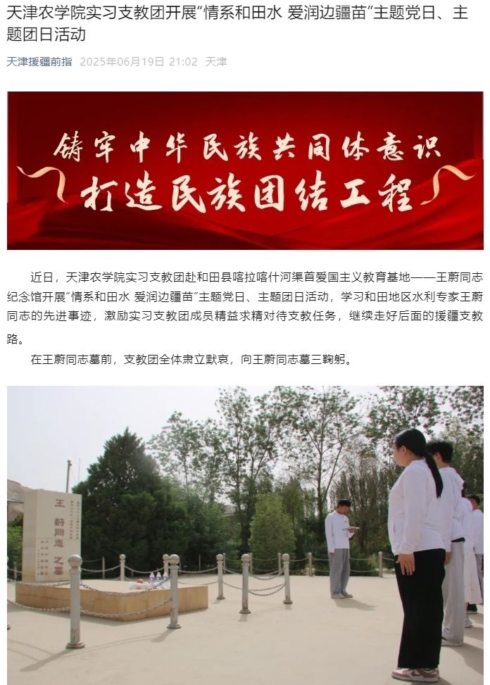 2023年6月19日,天津援疆前指公众号报道贝博实习支教团赴和田县喀拉喀什河渠首爱国主义教育基地——王蔚同志纪念馆开展“情系和田水 爱润边疆苗”主题党日、主题团日活动,学习和田地区水利专家王蔚同志的先进事迹,激励实习支教团成员精益求精对待支教任务,继续走好后面的援疆支教路。