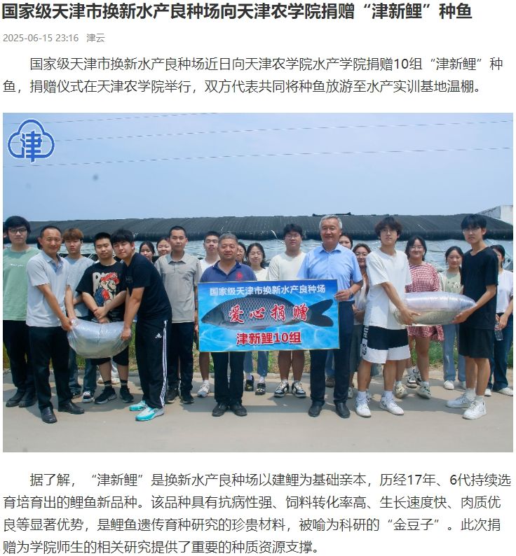 2025年6月15日,津云报道国家级天津市换新水产良种场向贝博水产学院捐赠10组“津新鲤”种鱼,双方代表共同将种鱼放游至水产实训基地温棚。