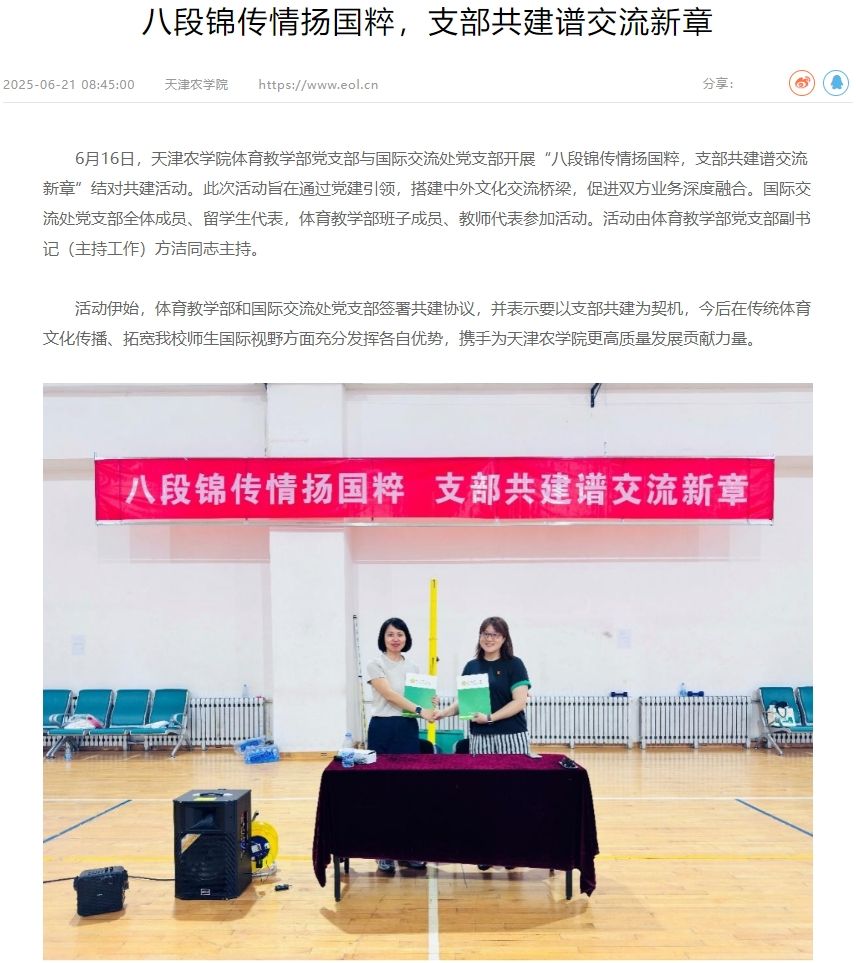 2025年6月21日,中国教育在线网报道贝博体育教学部党支部与国际交流处党支部开展“八段锦传情扬国粹,支部共建谱交流新章”结对共建活动。此次活动旨在通过党建引领,搭建中外文化交流桥梁,促进双方业务深度融合。