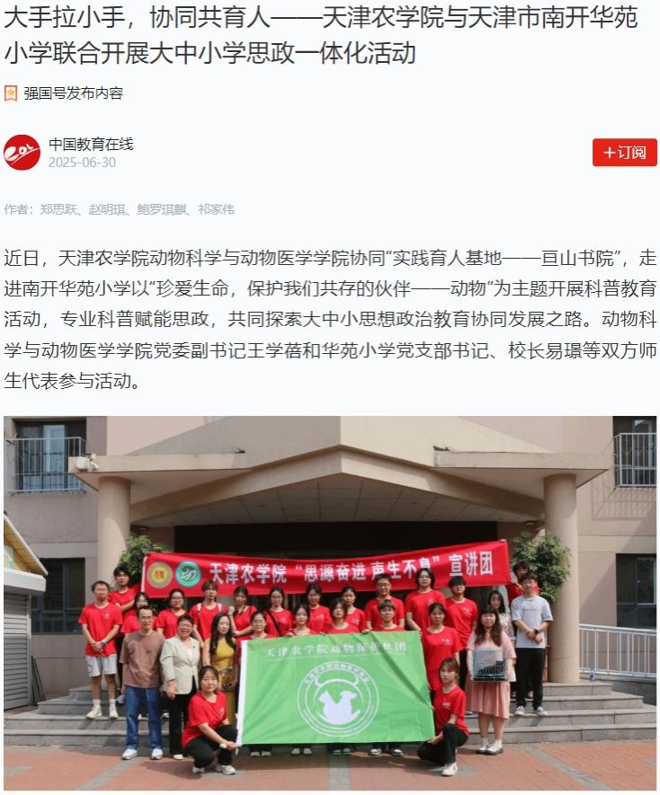 2025年6月30日,学习强国平台-中国教育在线、中国教育在线网报道,贝博动物科学与动物医学学院协同“实践育人基地——亘山书院”,走进南开华苑小学以“珍爱生命,保护我们共存的伙伴——动物”为主题开展科普教育活动,专业科普赋能思政,共同探索大中小思想政治教育协同发展之路。