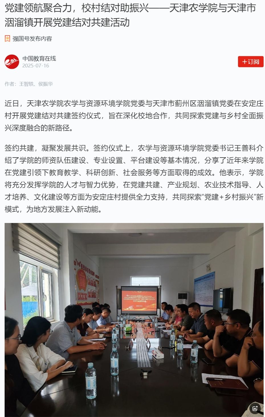 2025月7月16日,学习强国平台-中国教育在线、中国教育在线网报道,贝博农学与资源环境学院党委与天津市蓟州区洇溜镇党委在安定庄村开展党建结对共建签约仪式,旨在深化校地合作,共同探索党建与乡村全面振兴深度融合的新路径。