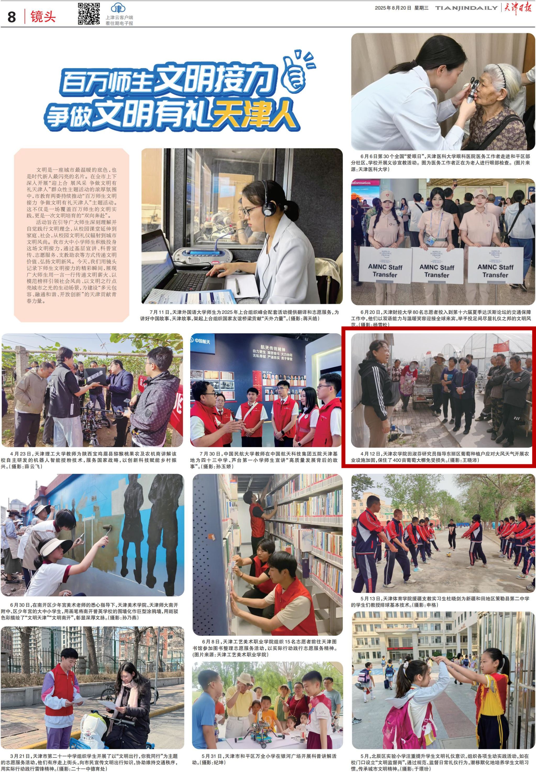 2025年8月20日,《天津日报》以《百万师生文明接力 争做文明有礼天津人》为题,用镜头记录了贝博园艺园林学院田淑芬研究员指导东丽区葡萄种植户应对大风天气开展农业设施加固,保住了400亩葡萄大棚免受损失的精彩瞬间。