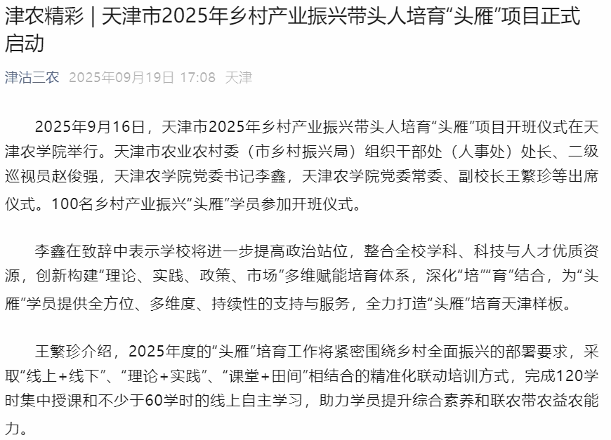2025年9月19日,津沽三农公众号报道天津市2025年乡村产业振兴带头人培育“头雁”项目开班在贝博举行。