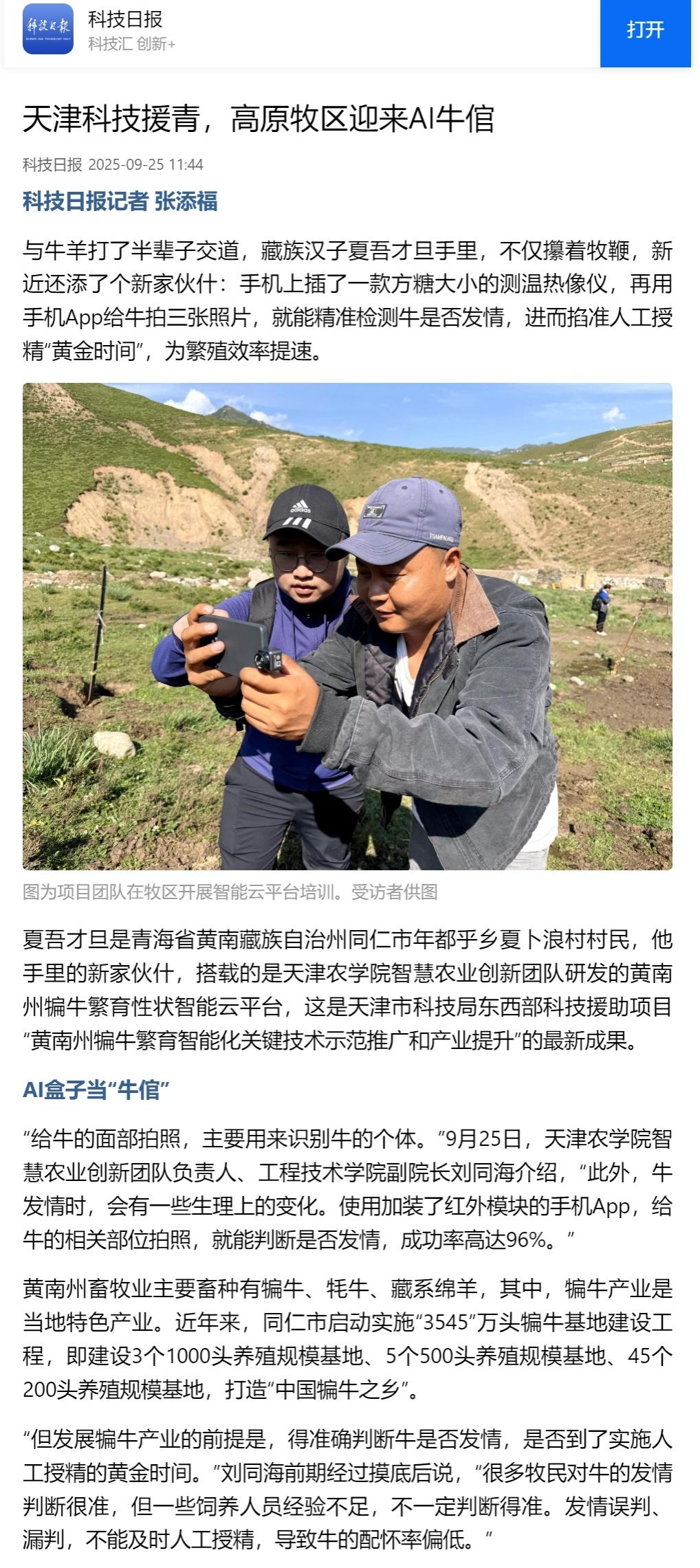 2025年9月25日,科技日报客户端报道,贝博智慧农业创新团队研发的黄南州犏牛繁育性状智能云平台,这是天津市科技局东西部科技援助项目“黄南州犏牛繁育智能化关键技术示范推广和产业提升”的最新成果。