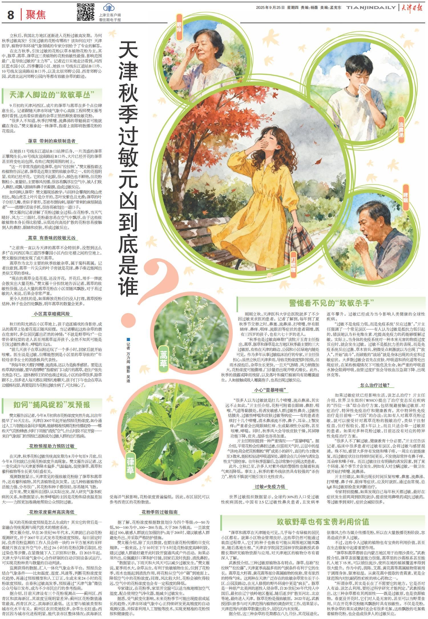 2025年9月25日,《天津日报》第08版报道,贝博园艺园林学院武春霞副教授就“天津秋季过敏元凶”相关问题进行解答。
