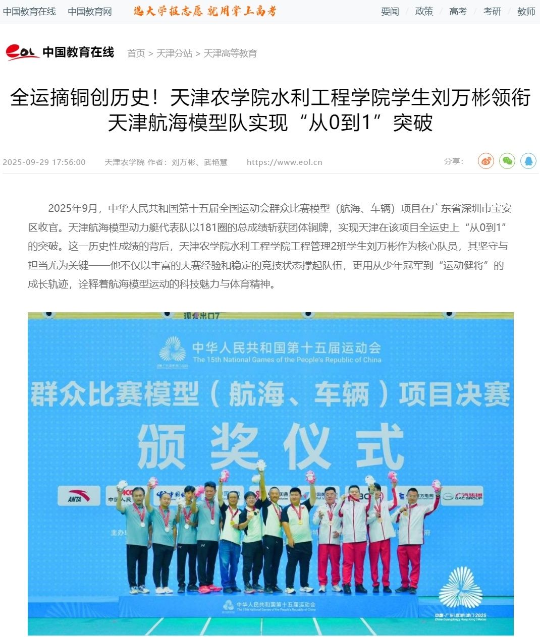 2025年9月29日,中国教育在线网报道贝博水利工程学院学生刘万彬领衔天津航海模型队实现“从0到1的突破。